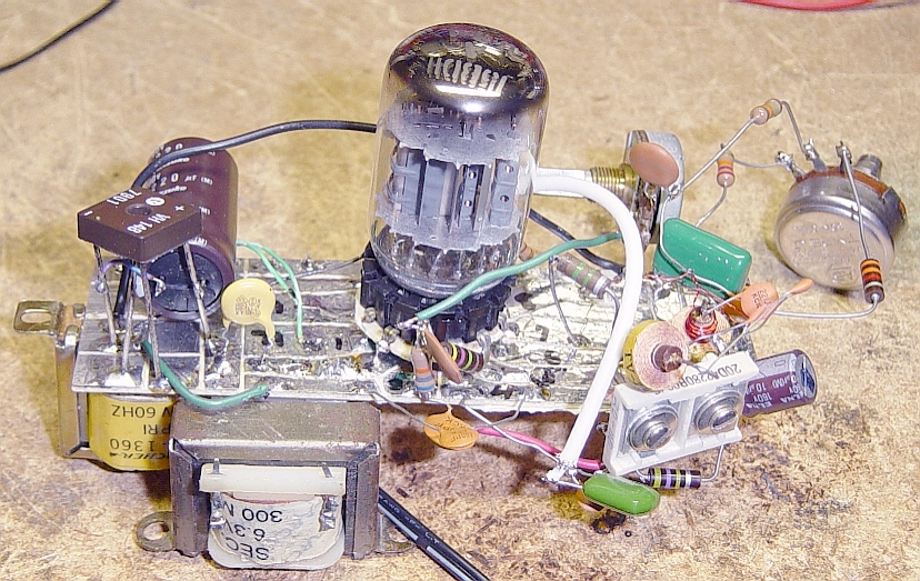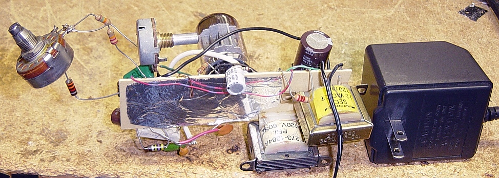 The unusual-looking breadboard is homebrew. I took a piece of plain PC board, and etched the pattern with a small, pointy file. Then I tinned it with solder, added the socket and then the components. The cathode resistor of the pentode was done by "lifting" the tube socket's pin from the board, and putting the R between the pin & the board. This simplified the rest of the layout, as I could use the larger foil area as a convenient ground.