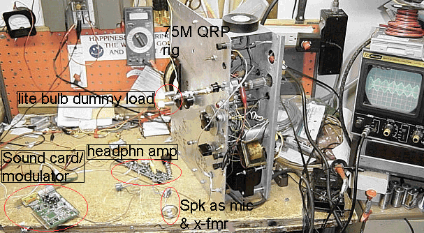 In this picture, you can see the seperate components... it's just alligator-clipped & tack-soldered together. The scope is showing approx. 50% sinewave modulation. Unfortunately, this setup started to distort quite a bit beyond 50%. (While it sounded 'OK' on voice, the sinewave test proved it wasn't practical.) The whole point was just the fact that I actually DID THIS with parts from a lightning-fried computer, a discarded B&W TV, and a broken TV test rig! :) With BTN, YOU CAN DO ANYTHING, if you put your mind to it!!! :) Just "Think outside the box" a little, be safe, and HAVE FUN!