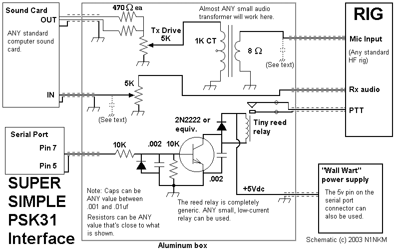 This page contains a schematic & photos to help you build a nice computer sound card interface. It has two pots, allowing complete and independent control of the receive and transmit audio levels between the computer and your rig. The TX audio goes through a transformer to provide step-down AND very low impedence to the mic input. This helps to reduce the risk of RFI, ground-loops, or hum pickup. Even with a LOT of RF in the shack, this design has proven itself to be very effective! :)
