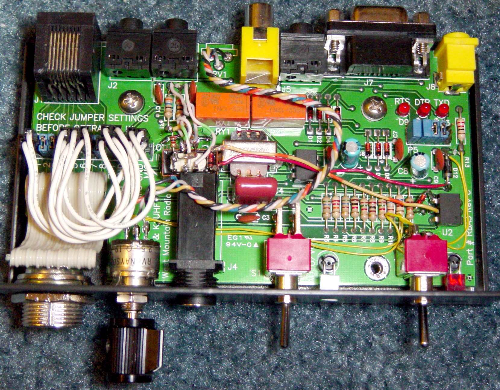 In the photo of the bottom of the board, those small yellow wires coming from the jumper area are to BYPASS the PTT when the POWER switch is turned off. (This allows the mic to still key the radio when the unit is off.) There is a small issue here- when the rig is powered on and the RigBlaster™ is off, the PTT voltage from the rig is getting back into the RB, and causing the POWER LED to glow dimly. With my radio, this hasn't been a problem. It actually serves as a nice reminder that the rig is ON when I'm upstairs! :) YOUR radio may not like this, so you may want to omit the power switch if this becomes a problem.