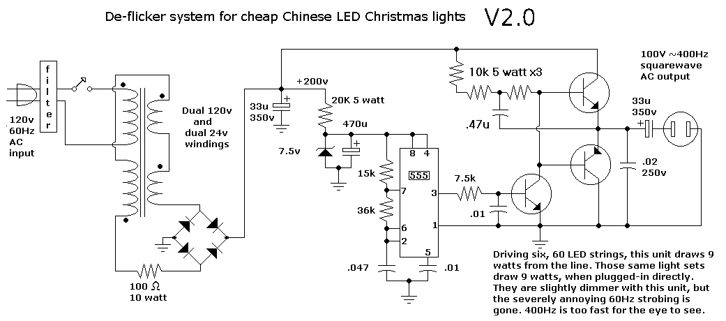 Ever buy one (or more) of those inexpensive LED Christmas lights, only to discover that they FLICKER like crazy? I bought 6 sets for $1.74, each, in 2011. When I plugged them in, I thought, "NO WAY!" The 60Hz flicker was absolutely awful! These sets are wired with 1/2 of the LEDs in one polarity, 1/2 in the other. That means I couldn't just power them with DC... so this project was born! :) (NOTE: Updated to V2.0 sometime after 2020) This site contains some of the V1.0 pics, but I've added the much better V2.0 info as needed.