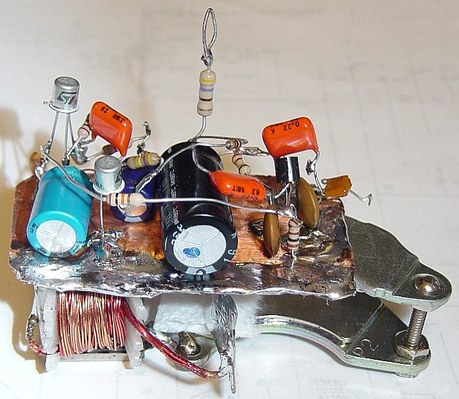 This mic also uses a custom wound audio transformer. (Scavenged from a CB.) This one has a much higher step-up ratio, however. It uses about 6 turns of #14 wire on the primary, and quite a few turns of #24 guage wire for the secondary. The output of this mic is considerably higher than the prototype!